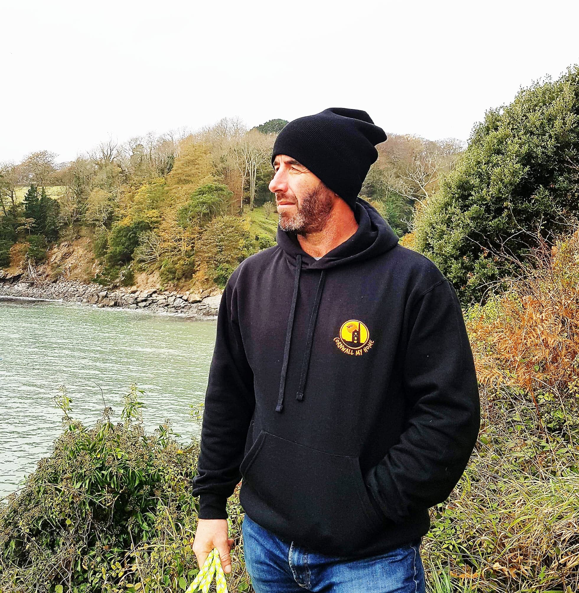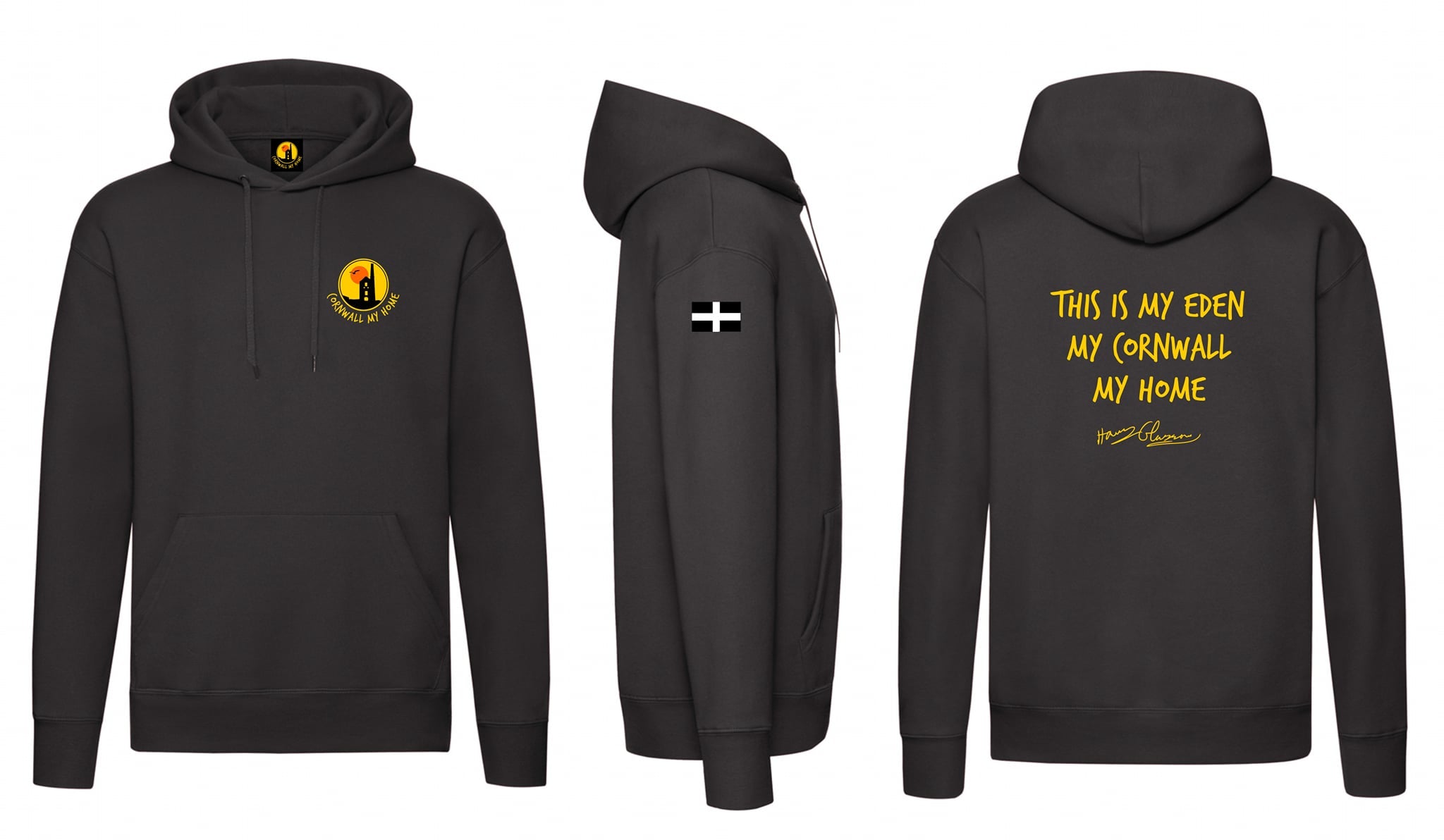 Cornwall My Home Hoodies are high quality products with embroidered logo on front, embroidered St Pirans Flag on sleeve and printed design on the back, including the signature of Harry Glasson.
